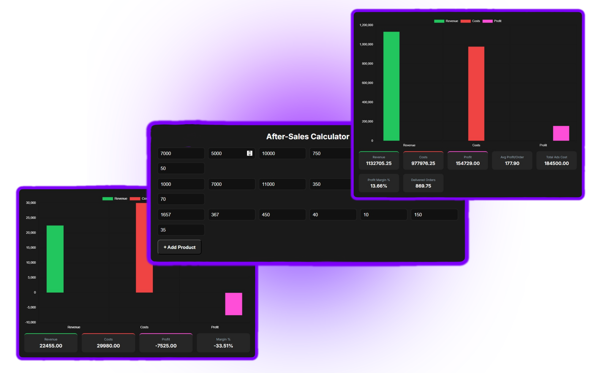 Easily enter your product price, cost, ad spend & order data to instantly see profits, losses, and ROI — whether you’re just testing an idea or tracking live sales.